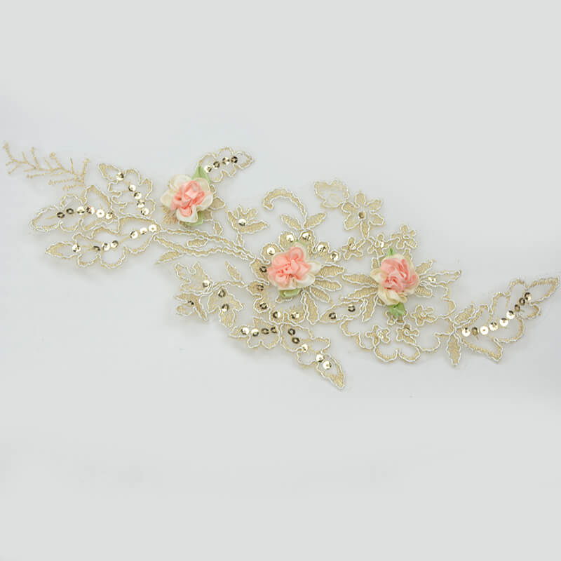 Gold lace applique is placed on the clothes like a gold necklace on the neck of the wearer. The same brilliance, grace, and luxury. Gold is a noble color. The value of clothes or skirts is instantly improving. The level of golden lace plus 3d flower embellishment color has been improving. What are you waiting for You need them in your factory or workshop!